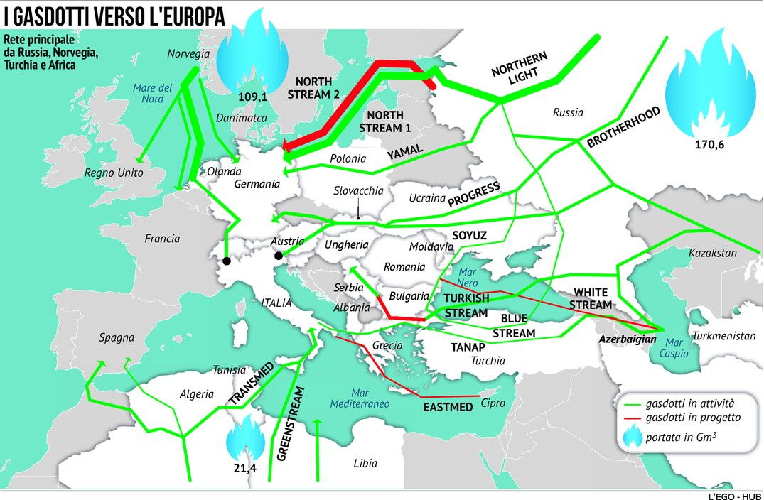 I gasdotti verso l'Europa: rete principale da Russia, Norvegia, Turchia e Africa