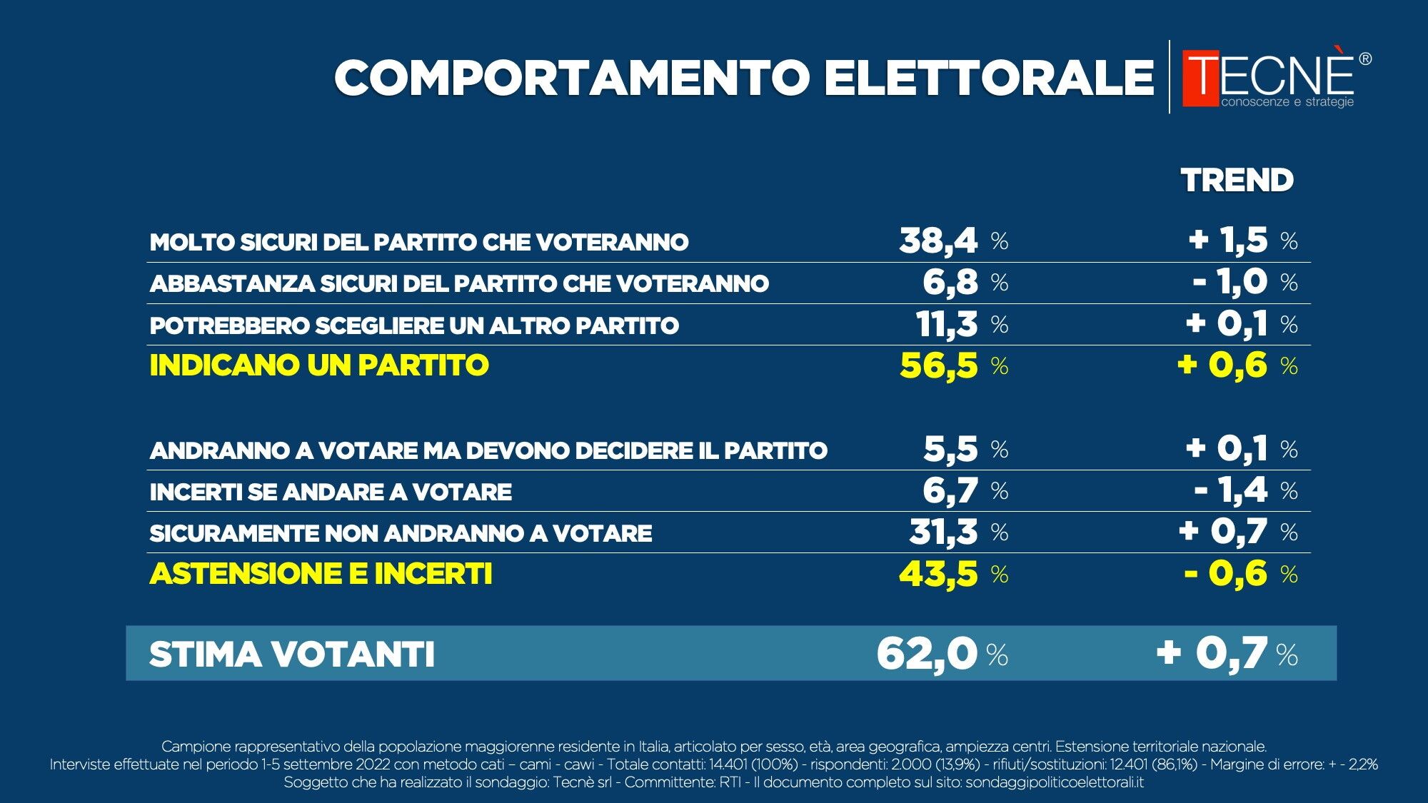 Elezioni 2022, le intenzioni di voto secondo Tecné