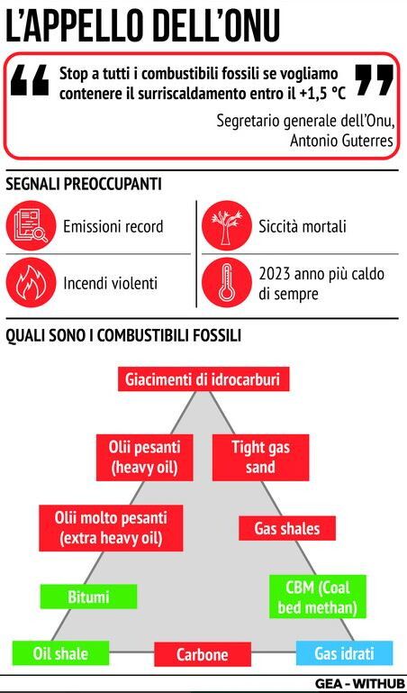 Cop28, l'appello dell'Onu: "Stop a tutti i combustibili fossili"