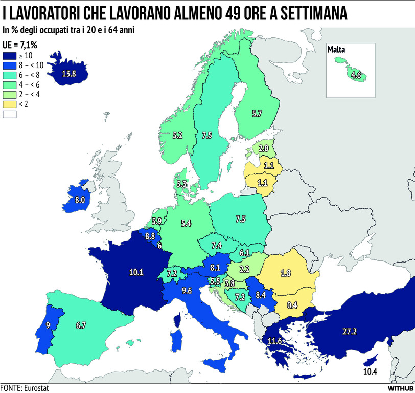 Ecco chi lavora almeno 49 ore a settimana in Europa