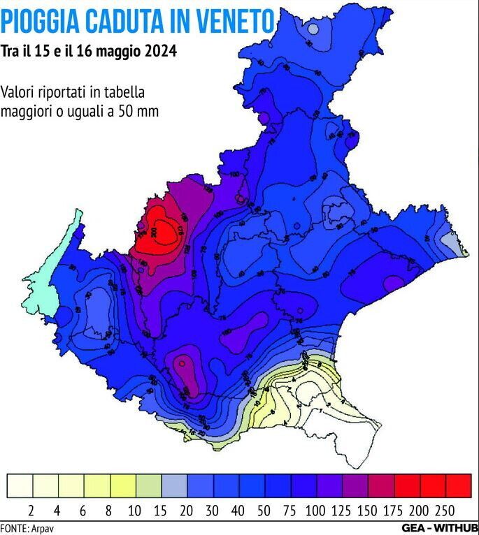 Maltempo, la pioggia caduta in Veneto tra il 15 e il 16 maggio 2024