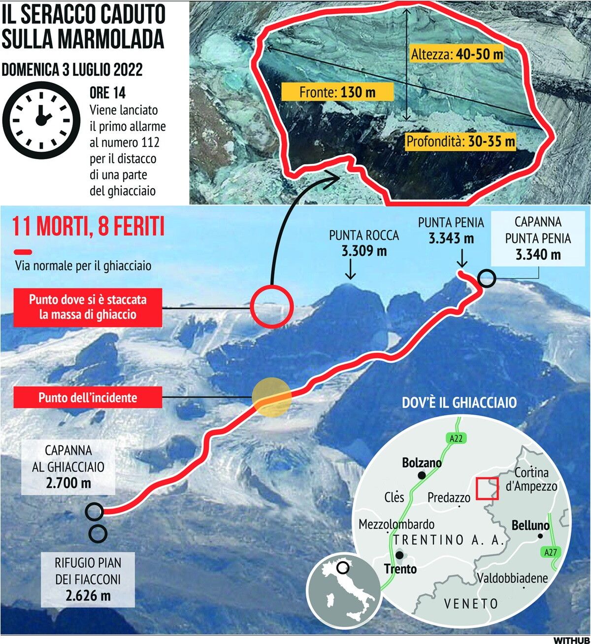 Tragedia Marmolada, il seracco caduto domenica 3 luglio 2022