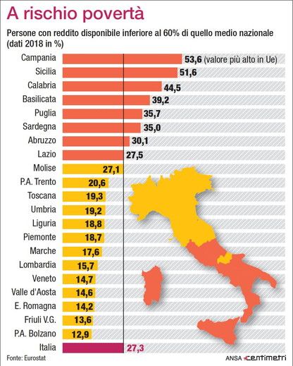 Persone a rischio povertà nelle regioni italiane secondo Eurostat