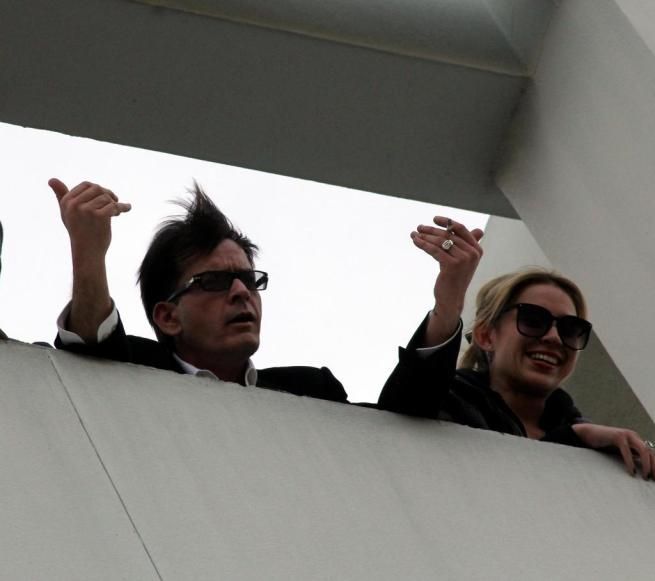 Spettacolo fuori programma per Charlie Sheen che si è messo a maneggiare un machete sopra la folla bevendo "Tiger Blood" (Foto Lapresse)