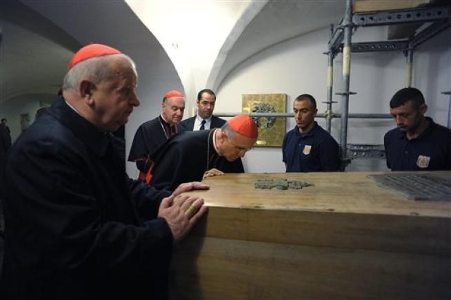 La teca con le spoglie di Wojtyla è stata estratta dalla tomba e portata vicino alla tomba di San Pietro, sempre nelle Grotte Vaticane, dove resterà fino al giorno della beatificazione. La teca si trova deposta sopra una carrello. Domenica sarà portata in San Pietro davanti all'altare centrale. Le Grotte Vaticane al momento sono chiuse e lo rimarranno fino al primo maggio.