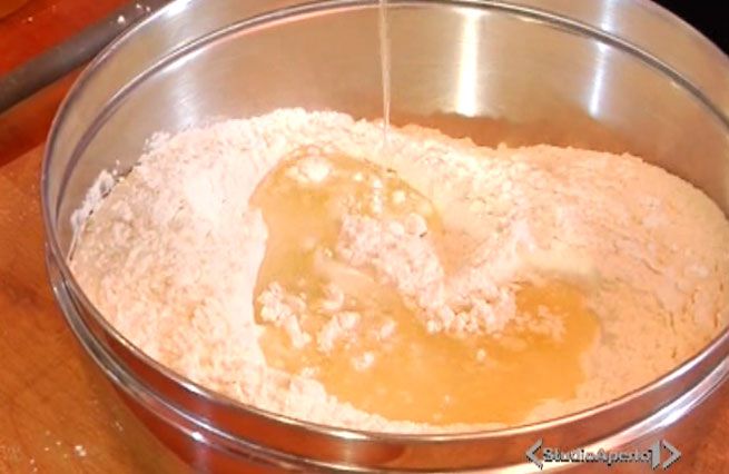 © Da video|In una terrina versare 500 gr di farina e mezza bustina di lievito di birra granulare, Aggiungere 70 gr di strutto sciolto, un pizzico di sale e...