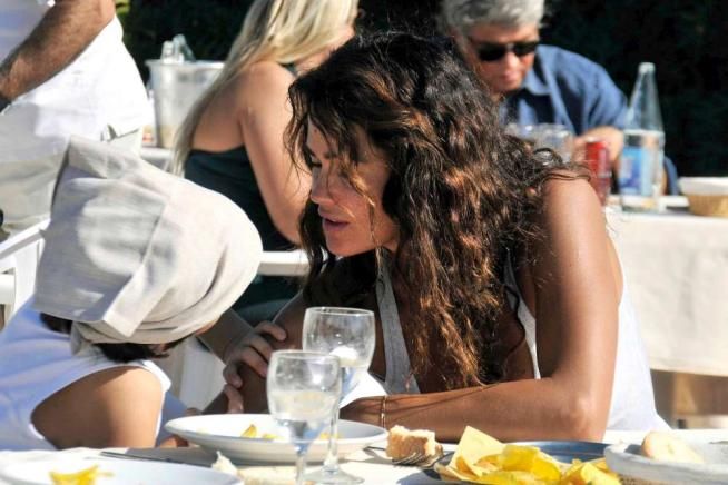 Qualche ora di sole, a Fregene, per un bel pranzetto con Brando. Ecco un'esplosiva Samantha De Grenet in canottiera bianca, mentre mangia all'aperto con il figlio.