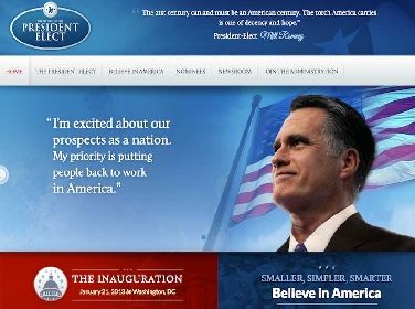E' restato visibile per pochi minuti, ma la testata "Political Wire" è riuscita comunque a fotografarlo. Il sito che Mitt Romney avrebbe pubblicato in caso di vittoria elettorale è andato online ieri pomeriggio. "Sono eccitato per la prospettiva che abbiamo come nazione. La mia priorità sarà far ritornare la gente a lavorare in America", questo il messaggio con cui Romney avrebbe inaugurato il proprio mandato. I repubblicani avrebbero voluto lanciarlo come “transition site”, simile a quella approntato dallo staff di Obama nel 2008, per fornire informazioni sul neo-presidente dal giorno delle elezioni fino al suo insediamento alla Casa Bianca. Il sito è stato subito messo online.