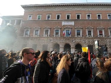 Bottiglie e petardi lanciati contro il ministero della Giustizia durante il corteo degli studenti, mentre gli agenti presidiano le strade di Roma.