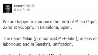 Stanchi ma al settimo cielo. Il calciatore del Barcellona Gerard Piqué e Shakira hanno avuto il primo figlio martedì sera e si chiama Milan. A dare la lieta notizia lo staff di Piqué sul Facebook ufficiale.