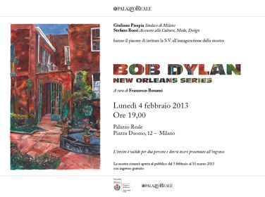 Dal 5 febbraio al 10 marzo 2013 Palazzo Reale ospita la prima mostra dei dipinti di Bob Dylan in Italia, esponendo nelle stanze dell’Appartamento di Riserva la serie più recente delle creazioni dylaniane, New Orleans Series, realizzata dall’artista nel 2012. La mostra, promossa e prodotta dal Comune di Milano Cultura Moda Design e da Palazzo Reale, è curata da Francesco Bonami. Tutti conoscono Bob Dylan come musicista, poeta della canzone e autore di testi entrati nella storia della musica come colonna sonora della vita di intere generazioni. A coronamento di questa carriera, nell’aprile del 2008 gli viene assegnato il Premio Pulitzer “per il profondo impatto sulla musica popolare e sulla cultura americana, grazie alle liriche composte e alla straordinaria forza poetica dei suoi testi”. Pochi però sanno che Dylan è da sempre anche un artista visivo, che disegna fin da quando era molto giovane e che verso la fine degli anni ‘60 ha iniziato a dipingere. La prima collezione di bozzetti e disegni, nata in un tour che lo portò dall’America in Europa e Asia tra il 1989 e il 1992, fu pubblicata nel 1994 in un libro dal titolo Drawn Blank ed esposta per la prima volta al Kunstsammlungen di Chemnitz in Germania nel 2007, rielaborata per la mostra in versione di acquarelli e gouaches con il titolo The Drawn Blank Series. Una seconda serie di tele vede la luce nel 2010, in occasione di una personale in Danimarca, alla National Gallery di Copenhagen, per la quale Dylan crea The Brazil Series. Il set dei 23 dipinti esposti nelle sale di Palazzo Reale sarà invece New Orleans: non la città del passato recente devastata dall’alluvione, bensì la New Orleans impregnata nell’atmosfera un po’ losca ma cool degli anni ‘40 e ‘50. La mostra è una narrazione personale, dove ogni opera è un frammento di una storia più grande e ogni immagine vive a metà fra sogno e ricordo.