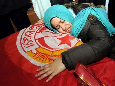 Parenti e sostenitori dell'opposizione rendono omaggio alla salma del loro leader, Chokri Belaid, ucciso sotto casa, e fanno le condoglianze alla vedova (la donna con i capelli grigi). Nei giorni scorsi Belaid, che guidava il partito laico contro i musulmani al governo, aveva denunciato minacce di morte e tentativi di intimidazioni nei suoi confronti.