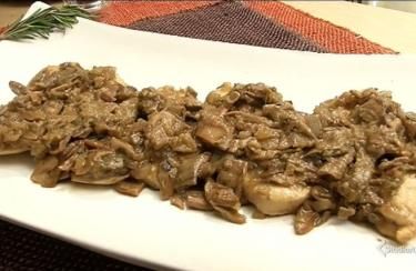 © Da video|Ricoprite i petti di pollo con parte dei funghi. Abbassate la fiamma e unite ai funghi rimasti in padella un po’ di farina: mescolate bene e, appena ottenuta una delicata cremina trasferiteli sul piatto.