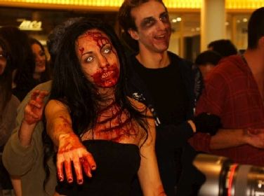 È stata la più grande “zombie walk” realizzata in Italia, organizzata da due associazioni che si occupano di cultura giovanile, Satyrnet (www.satyrnet.it) e Proiezioni Mentali. Circa centocinquanta ragazzi hanno sfidato vento e pioggia e si sono vestiti da zombie per sfilare poi (al chiuso, nel Centro Commerciale Euroma2, a Roma) e “conquistare il mondo degli umani”.