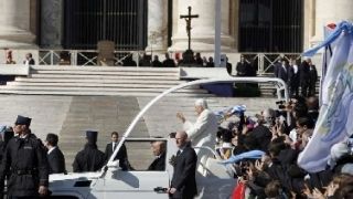 Decine di bambini si sono spostati in alcuni punti vuoti della piazza, utilizzati come vie di fuga, per seguire il passaggio di Benedetto XVI in piazza nella papamobile. Molti urlavano "Benedetto" e per i bimbi è diventato un gioco seguire il papa lungo il suo tragitto, dietro le transenne, per salutarlo.