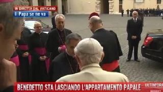 Benedetto XVI ha lasciato l'appartamento papale. Prima di recarsi a Castel Gandolfo, il Papa è stato salutato da tutti i suoi più stretti collaboratori tra cui il vicario di Roma, il cardinale Agostino Vallini, e il vicario per la Città del Vaticano, cardinale Angelo Comastri.