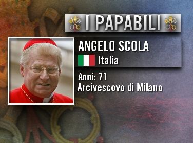 © Tgcom24|Angelo Scola (Malgrate, 7 novembre 1941) è un cardinale e arcivescovo cattolico italiano, arcivescovo di Milano dal 28 giugno 2011. Nasce il 7 novembre 1941 a Malgrate da Carlo, camionista, e Regina Colombo, casalinga. Partecipa all'Azione Cattolica e frequenta il liceo classico Alessandro Manzoni a Lecco. Nel 1958 incontra per la prima volta don Luigi Giussani a Lecco e rimane colpito dalla sua figura. Ha studiato filosofia all'Università Cattolica del Sacro Cuore. Tra il 1965 e il 1967 è anche presidente della FUCI di Milano. Diventa prete quando nel 1967 entra l seminario diocesano milanese. Ha un dottorato in teologia. Partecipa attivamente al movimento Comunione e Liberazione. Ha insegnato all'Università di Friburgo e poi alla Pontificia Università Lateranense. È stato vescovo di Grosseto (1991), Patriarca di Venezia (2002) e poi arcivescovo di Milano (2011).Ti piacerebbe come papa? Votalo nel sondaggio di TGCOM24