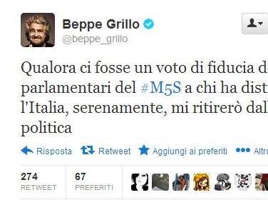 Fiducia a un governo diverso da quello a Cinque Stelle? Non sembra proprio, almeno a leggere il tweet del leader del Movimento, Beppe Grillo, che, mentre i suoi capigruppo a Camera e Senato incontrano i giornalisti a Roma, sul web lancia un messaggio forte e chiaro a tutti i neoeletti: "Qualora ci fosse un voto di fiducia dei gruppi parlamentari del M5S a chi ha distrutto l'Italia, serenamente, mi ritirerò dalla politica".
