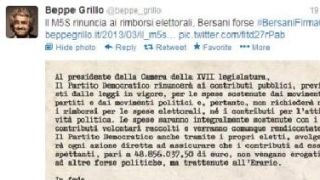 per le spese sostenute dai partiti e dai movimenti politici e non richiederà né i rimborsi per le spese elettorali, né i contributi per l'attività politica. Si tratta di 42.782.512,50 di euro che appartengono ai cittadini...", ha scritto Grillo, comico e leader del M5s. "Il MoVimento 5 Stelle, anche tramite i propri eletti, svolgerà ogni azione diretta ad assicurare che i contributi ad esso spettanti non vengano erogati ad altre forze politiche, ma trattenuti all'Erario".