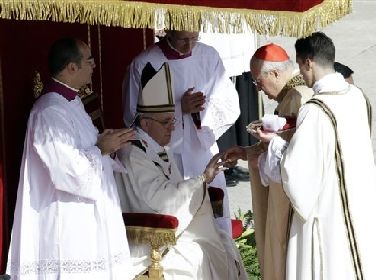Il cardinale decano, Angelo Sodano, consegna a Papa Francesco l'anello del pescatore. E' uno dei simboli del ministero petrino e Papa Bergoglio lo ha voluto in argento e non in oro.