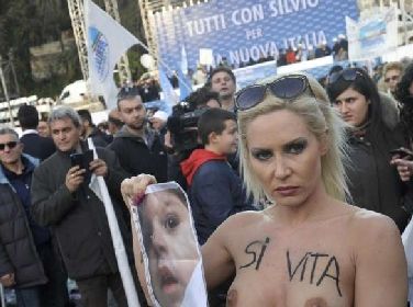 Una giovane donna, con solo un perizoma color carne addosso, ha manifestato, presumibilmente infavore dell'uso delle cellule staminali, al termine della manifestazione del Pdl in piazza del Popolo. La ragazza dai capelli biondi, sul corpo aveva una scritta "Sì vita, sì stamina", sulla schiena la scritta "Balduzzi dicci di sì" e in mano una foto con un volto, presumibilmente di un malato. La donna è stata portata via da alcuni agenti di polizia, che prima l'hanno coperta con una bandiera tricolore.