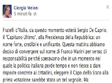 L'annuncio a sorpresa Giorgia Meloni lo fa sulla sua pagina Facebook: "Fratelli d’Italia, da questo momento voterà Sergio De Caprio, il ‘Capitano Ultimo’, alla Presidenza della Repubblica: un nome forte, credibile e unificante". Il carabiniere italiano è stato a capo del Crimor ed è noto soprattutto per aver arrestato Totò Riina nel 1993. Attualmente con il grado di colonnello è vice comandante del Noe (Nucleo Operativo Ecologico) a Roma. La Meloni ha così spiegato la scelta di Fratelli d'Italia: "Questa mattina abbiamo deciso di convergere sul nome di Franco Marini per senso di responsabilità perché speravamo che in un momento nel quale la politica italiana perde tempo e non riesce a dare risposte concrete ai cittadini, eleggere il Capo dello Stato alla prima votazione sarebbe stato un bel segnale. Ma proponendo Marini il Pd ha dimostrato di non saper cogliere la domanda di cambiamento che arriva dal popolo e il Pdl a sua volta non ha saputo proporre alcuna alternativa che potesse essere espressione del centrodestra dopo l’occupazione di tutte le alte cariche istituzionali dello Stato da parte del centrosinistra".