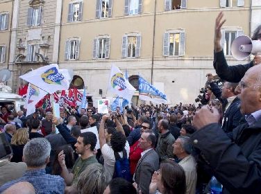 Un gruppo di manifestanti anti-Prodi, all'esterno della Camera, fa festa al termine del quarto scrutinio per l'elezione del Presidente della Repubblica che ha visto il candidato del Pd non raggiungere il quorum.