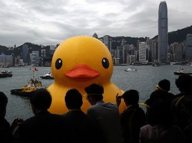 "Rubber Duck" è la mega opera d'arte dell'artista concettuale olandese Florentijn Hofman. Il "pennuto" galleggia vicino a Ocean Terminal a Victoria Harbour, Hong Kong. La scultura di 16,5 metri di altezza sarà mostrata al pubblico per un mese.