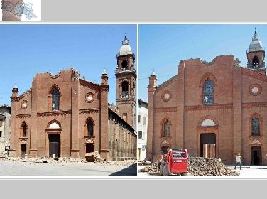 © Ansa|Il duomo di Mirandola dopo il sisma del maggio 2012 e come si presenta nel maggio 2013