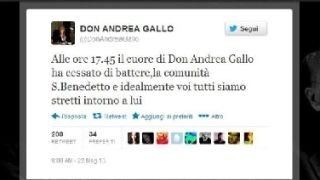 Pochi minuti dopo l'annuncio arrivato sulle agenzie della morte di don Andrea Gallo anche sul profilo twitter del prete veniva confermata la notizia. Sono stati gli stessi collaboratori del sacerdote che gestiscono l'account a dare l'annuncio.