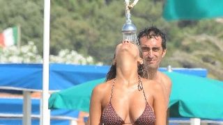 Roberta Morise in spiaggia a Forte Dei marmi con il nuovo fidanzato, il tennista Potito Starace. Ecco i due che si fanno una doccia sexy in spiaggia.