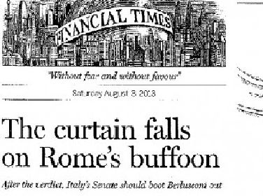 "Cala il sipario sul buffone di Roma. Dopo il verdetto, il Senato dovrebbe cacciare Berlusconi". Non usa mezze misure il Financial Times nel commentare la conferma della condanna a Silvio Berlusconi nel processo Mediaset. Il quotidiano finanziario londinese, proseguendo nel suo affondo, scrive: "Se avesse un briciolo di onore, ora si dimetterebbe, risparmiando così ai suoi colleghi senatori l'imbarazzo di dover cacciare un ex primo ministro".