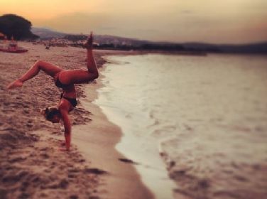 Giulia Calcaterra si allena sul bagnasciuga. In attesa di rivederla sul bancone di Striscia, la velina bionda si mantiene in forma dedicandosi a pericolose acrobazie sul litorale della Sardegna. Bikini nero e corpo statuario, la Calcaterra mette in evidenza non solo una particolare agilità ma anche un perfetto lato B, incorniciato solo da un micro tanga. E l'attenzione si sposta subito lì...
