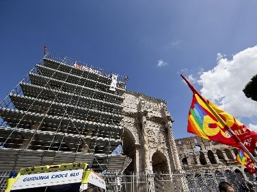 Il loro contratto è in scadenza e per questo un gruppo di ex vigilantes dell'Istituto dell'Urbe si è arrampicato sull'Arco di Costantino a Roma. "Lavoro, diritti, dignità": questo lo striscione che mostrano i lavoratori. "Vogliamo parlare con il sindaco Marino, vogliamo garanzie sui nostri stupendi e il nostro lavoro", chiedono. Uno di loro si è sentito male ed è dovuto scendere dal monumento.