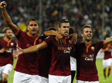 La squadra di Garcia supera gli emiliani per 3-1 e balza in testa alla classifica. Ecco le foto