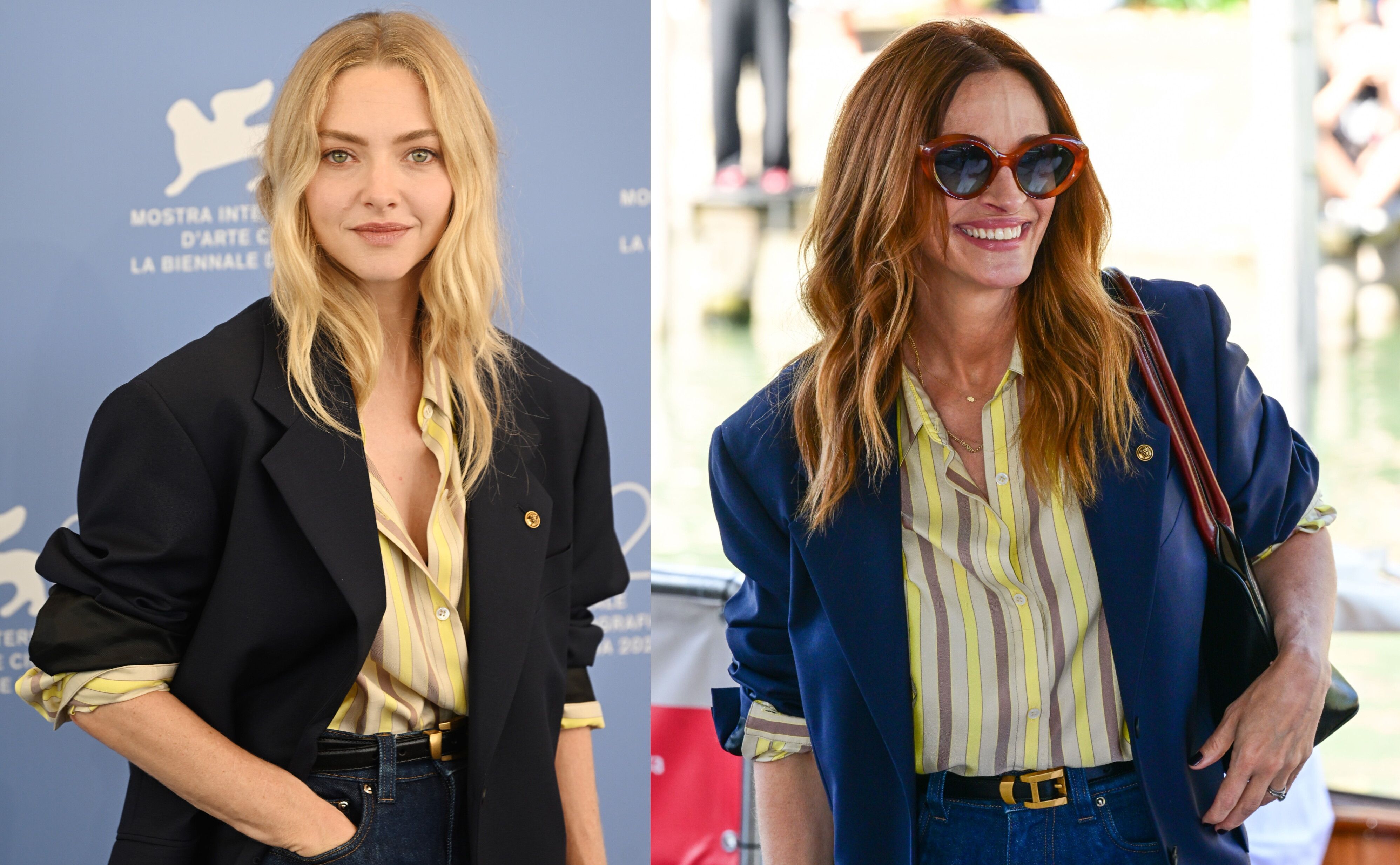 Stesso blazer, stessa camicia a righe, stessi jeans. Colpo di scena a Venezia 82: Amanda Seyfried, per il suo arrivo al Lido, ha indossato lo stesso look di Julia Roberts. Il fatto, piuttosto inedito, è avvenuto a pochi giorni di distanza e sarebbe il frutto di una proposta avanzata dalla stessa attrice alla collega, come ha rivelato la stylist Elizabeth Stewart. Nessuna gaffe, quindi, ma un esempio di generosità, solidarietà femminile e sostenibilità.