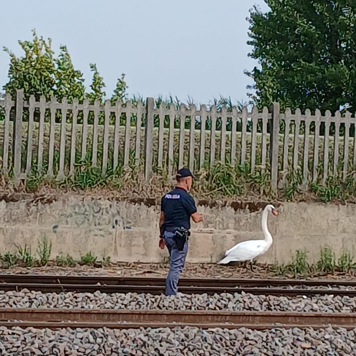 Un cigno stava volando sopra I'area ferroviaria di Mantova, quando, alcuni giorni fa, una forte raffica di vento gli ha fatto urtare i cavi elettrici in prossimità del binario 5 della stazione. L'animale è caduto a terra stordito, riportando ferite al collo e a un'ala. Vista la scena in diretta, gli agenti della polizia ferroviaria hanno immediatamente segnalato il fatto al dirigente di movimento, accertando che nessun convoglio fosse previsto in transito sui binari per poter avere margine d'intervento. I poliziotti sono riusciti a condurre il cigno fino a un'area verde adiacente ai binari. Immediatamente allertata, la centrale operativa della polizia provinciale, titolare per gli interventi sulla fauna selvatica, si è adoperata con personale specializzato che, raggiunti i binari in sicurezza, con apposite attrezzature, ha catturato il cigno. L'animale, a causa delle ferite, è stato trasportato presso la struttura "Loghino Bosco" di Curtatone per le cure necessarie e poi liberato. La scena del salvataggio in stazione, seguita da diversi passeggeri in attesa sulla banchina ferroviaria, si è conclusa con gli applausi per la riuscita dell'intervento.