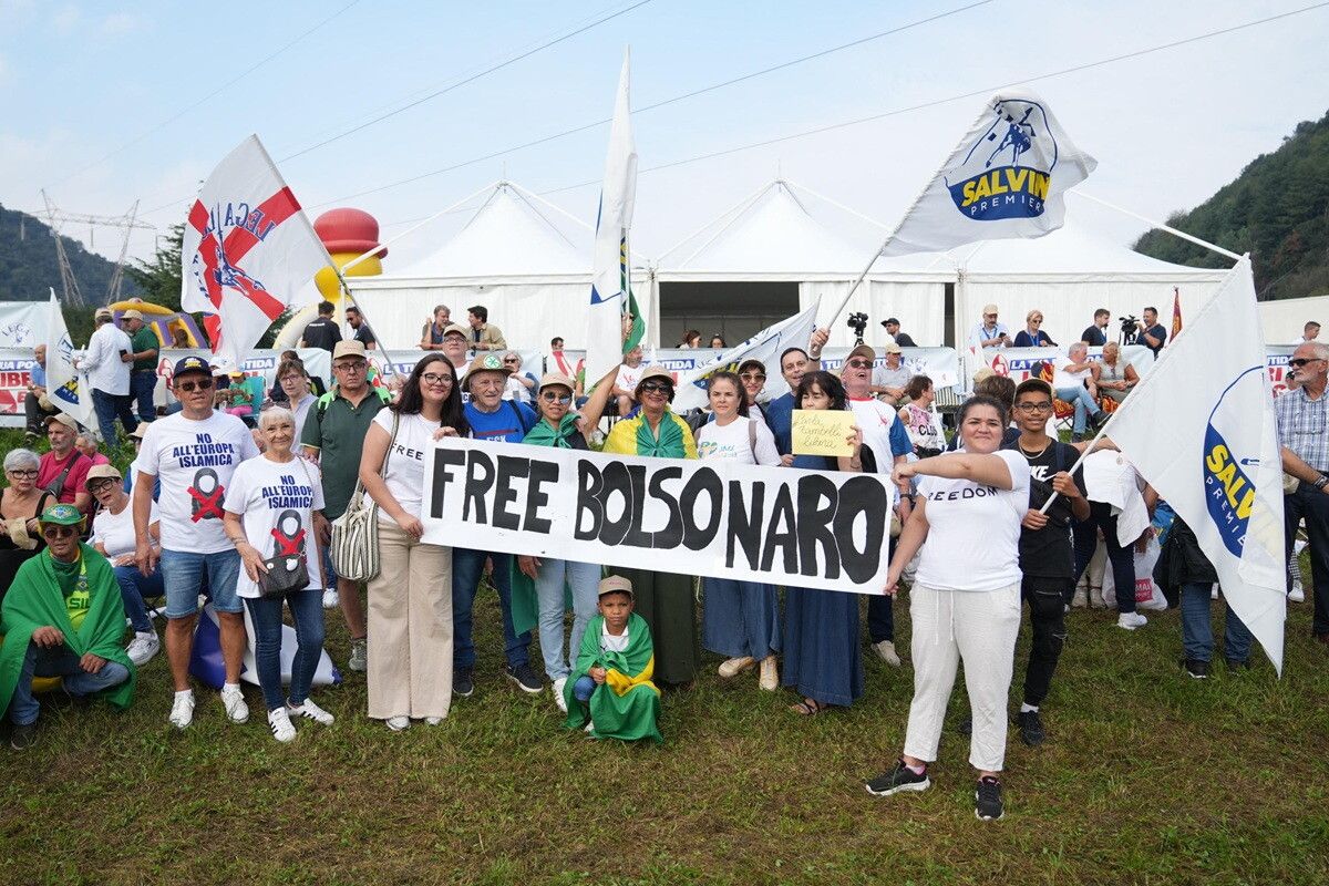 Dal prato di Pontida arriva la solidarietà all'ex presidente brasiliano Jair Bolsonaro, condannato a 27 anni di carcere per tentato golpe. Un gruppo di persone con le bandiere brasiliane ha esposto uno striscione con scritto "Free Bolsonaro", chiedendo anche "libertà" per la deputata brasiliana Carla Zambelli. Tra gli ospiti internazionali di Pontida è previsto anche Flávio Bolsonaro, componente del Senato federale del Brasile e figlio dell'ex presidente. Sul pratone anche una bandiera di Israele sventolata insieme a una della Lega. Dal palco, Luca Zaia, insieme ai suoi consiglieri regionali, ha srotolato la storica bandiera del leone di San Marco. "Questa bandiera ha 1.100 anni di storia ed è l'unica che ha la parola 'pace' dentro, e in un momento così in cui è inaccettabile che ci siano bambini e donne ammazzati, noi diciamo che non siamo per la guerra. La diplomazia dialoghi, un mondo in guerra non fa bene a nessuno", ha detto il presidente del Veneto e storico esponente del Carroccio.