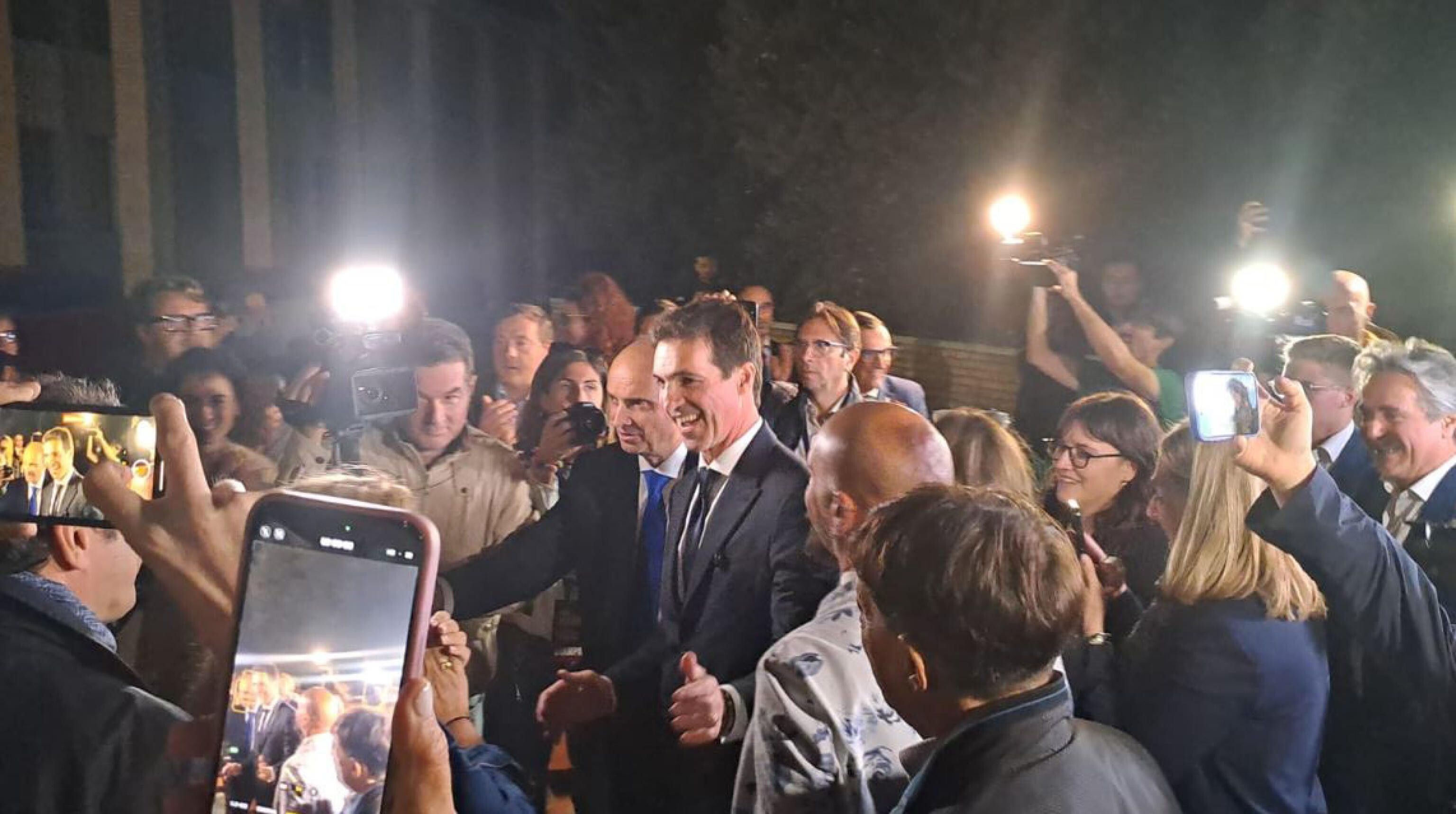 Festa in Regione, dopo la vittoria che lo ha confermato alla presidenza delle Marche per Francesco Acquaroli, arrivato a Palazzo Leopardi, sede del consiglio regionale, dopo aver festeggiato al proprio comitato elettorale. Accolto tra gli applausi degli esponenti della coalizione di centrodestra che lo ha sostenuto, Acquaroli ha salutato i presenti e si è concesso ai fotografi. "Non mi aspettavo un risultato di queste dimensioni - ha detto - quello che abbiamo seminato ha portato i suoi frutti".