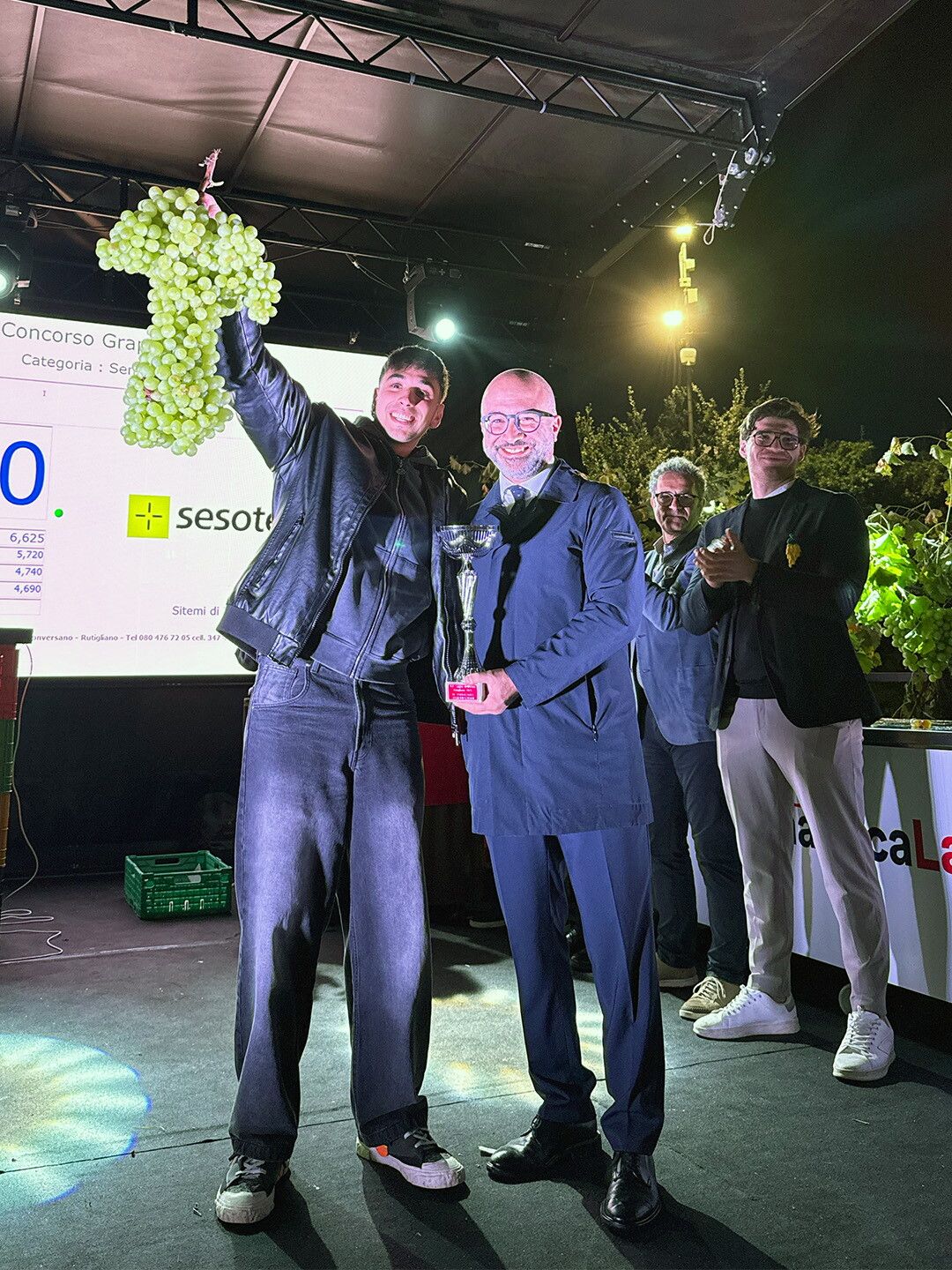 Con quasi sette chili di peso, per la precisione 6,625, si è classificato primo al Concorso del Grappolo Gigante, organizzato nel corso della 61esima Sagra dell'Uva di Rutigliano, nel Barese. Il grappolo da record è della varietà Navsel bianca senza semi ed è stato prodotto nei vigneti dell'azienda locale Agrimessina.