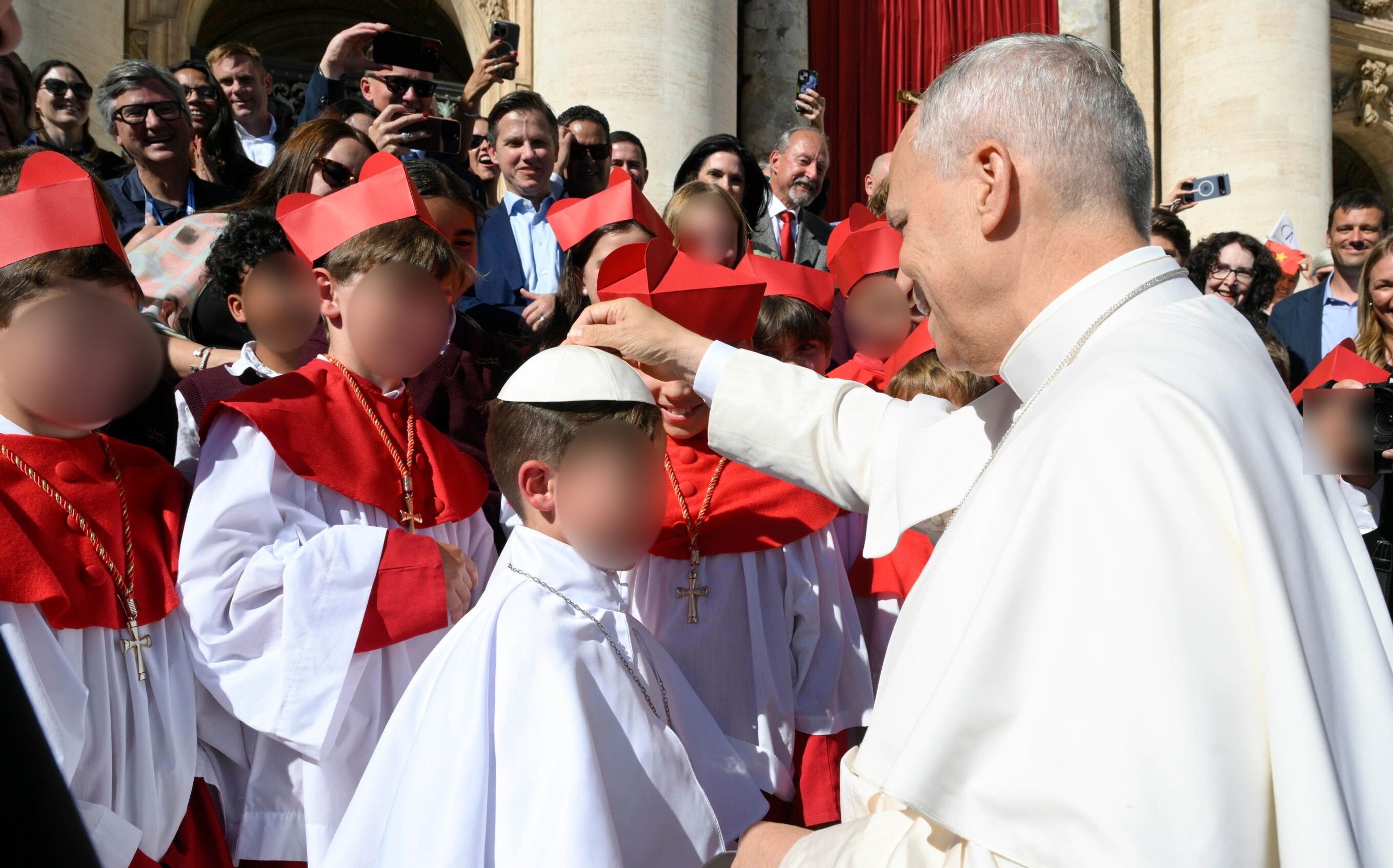 Tra i piccoli "porporati" c'era anche un bambino vestito da Papa, con tanto di talare bianca e zucchetto. Con lui Leone ha scambiato alcune battute scherzose, in un momento di allegria e spontaneità che ha strappato sorrisi ai presenti. Un incontro che dal virtuale è diventato reale, trasformando un gioco diventato fenomeno social in un ricordo indimenticabile per questi giovani pellegrini americani. Il Pontefice (vero) ha poi salutato e benedetto altri bambini e altri fedeli.