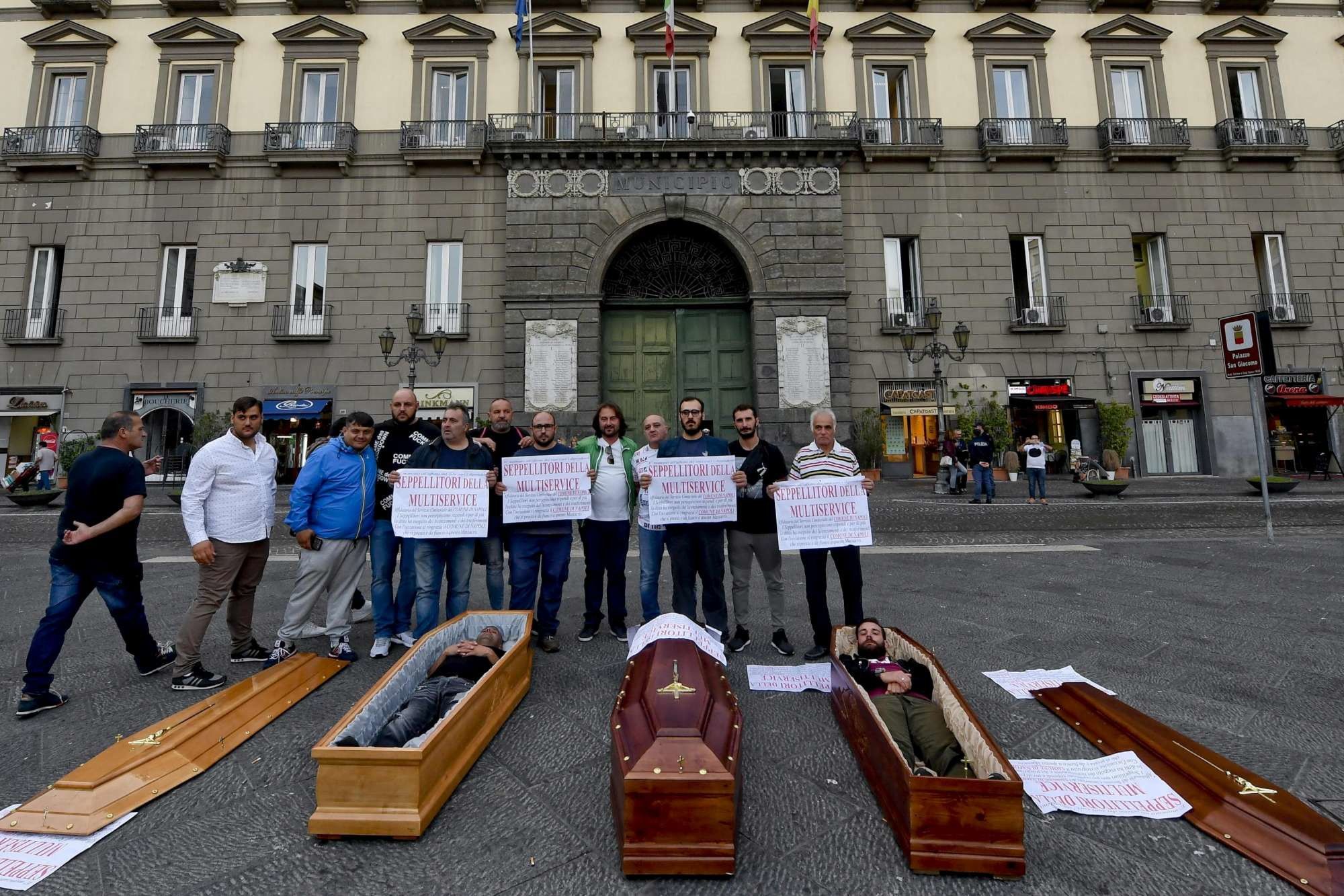 Napoli, la macabra protesta dei seppellitori con bare e finti cadaveri