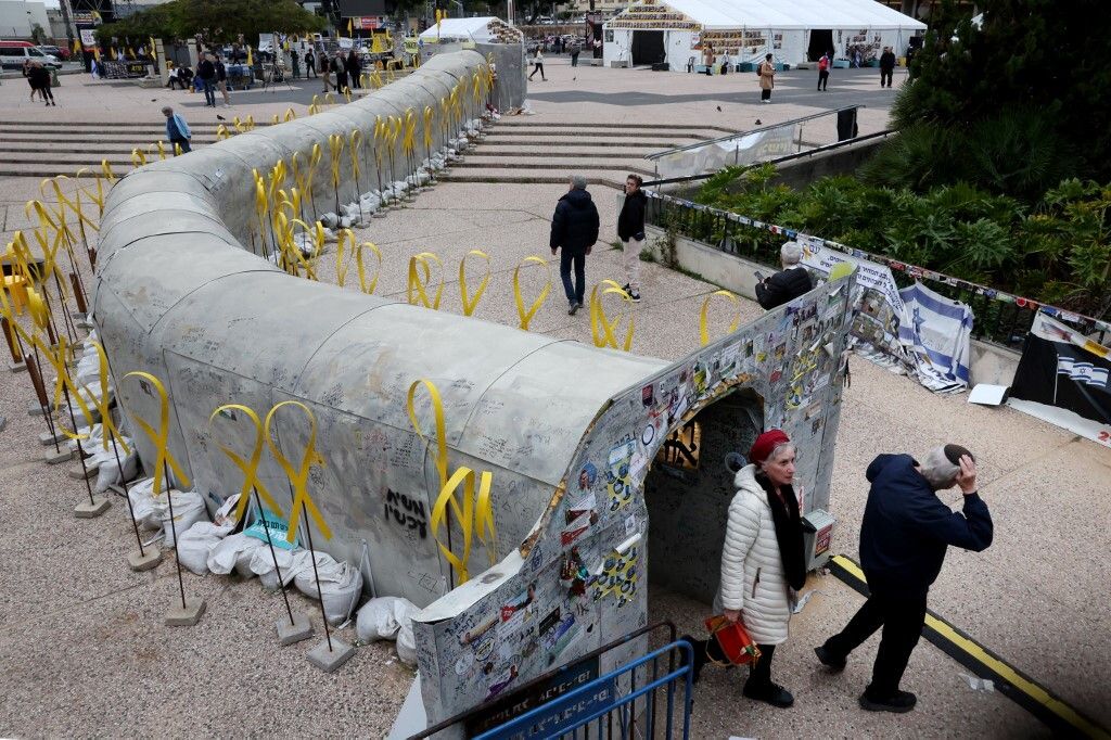 A Tel Aviv, nella Piazza degli Ostaggi dove gli israeliani attendono il rilascio dei loro famigliari ancora in mano ad Hamas, è comparso un finto tunnel in cui entrare e provare a immaginare come possono sentirsi i rapiti senza luce, senza aria, con il suono di passi sempre minacciosi e l'eco delle esplosioni.