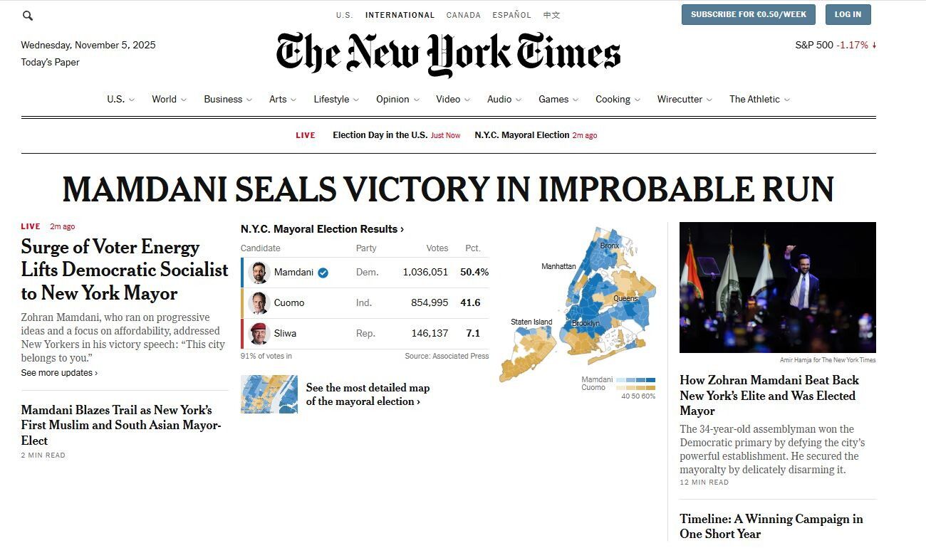 Zohran Mamdani eletto sindaco di New York. Ecco le "homepage" delle principali testate d'informazione americane, che hanno definito la sua vittoria "storica", sottolineando la portata simbolica di un sindaco musulmano alla guida della città più cosmopolita degli Stati Uniti.