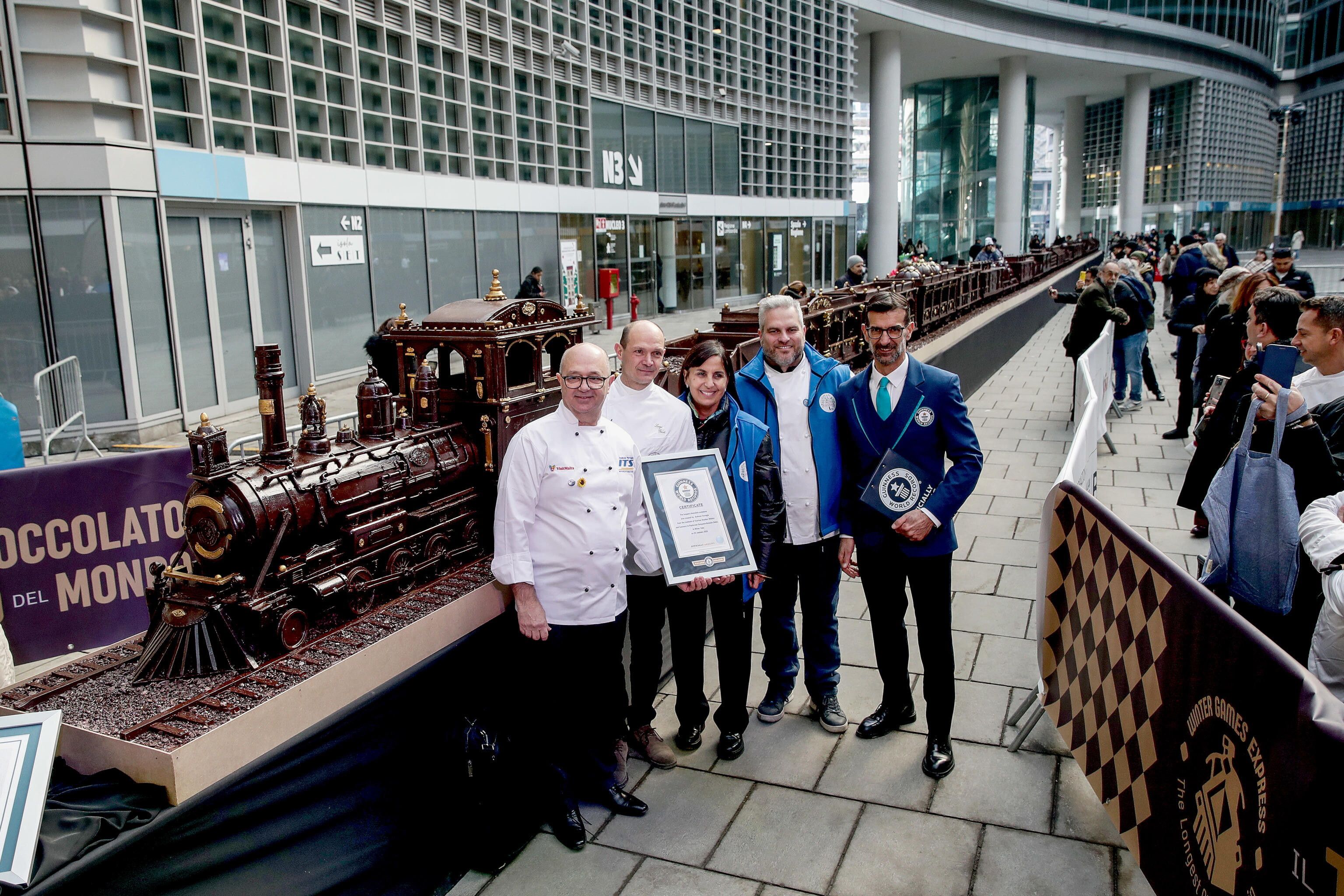 Ai piedi di Palazzo Lombardia a Milano è stata presentata la scultura di cioccolato più lunga del mondo. Il treno, lungo 55 metri e pesante 28 quintali, è stato misurato dai giurati del Guinnes world record che hanno dichiarato il suo primato mondiale. A ricevere il premio, i rappresentanti di tutti i pasticcieri e cioccolatieri che hanno partecipato all'impresa titanica.