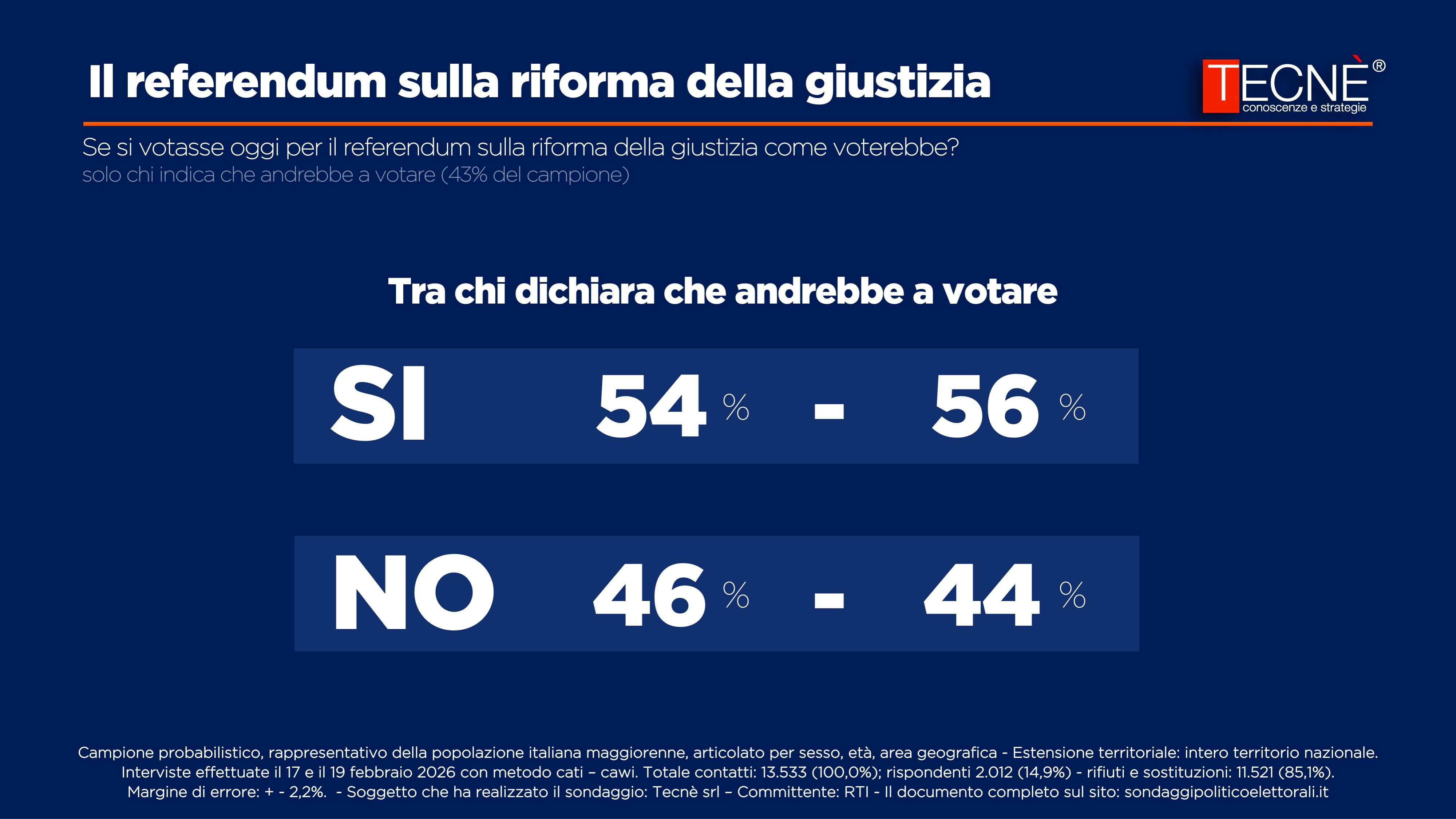 Se si andasse a votare oggi, al referendum sulla riforma della giustizia vincerebbe il Sì, stimato al 54-56%. Il No, invece, si attesterebbe sul 44-46%. Lo certifica il sondaggio realizzato da Tecnè, commissionato da RTI. Allo stato attuale, andrebbe a votare il 43% della popolazione italiana. Il 45%, invece, non si recherebbe alle urne, mentre il 12% si dice "indeciso". Potenzialmente, dunque, andrebbe a votare fino al 55% della popolazione italiana.
