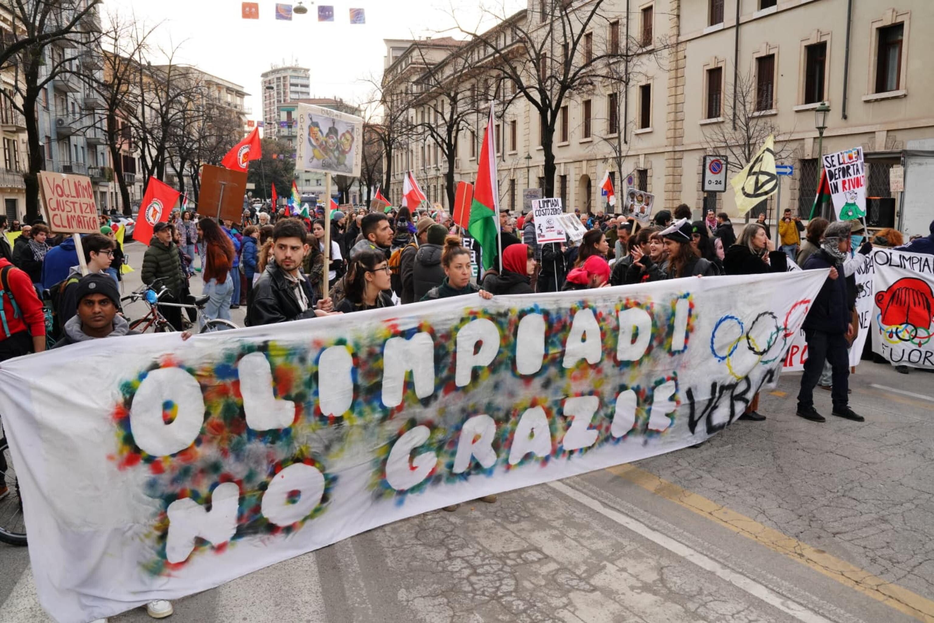 Cinquecento persone circa hanno preso parte al corteo organizzato dal "Comitato Olimpiadi Verona No Grazie" organizzato nella città scaligera questo pomeriggio. Il corteo, partito da Porta Palio, ha sfilato per le vie della città a ridosso dell'area blindata, in occasione della cerimonia di chiusura dei Giochi Olimpici. I manifestanti hanno alzato al cielo bandiere della Palestina, della pace, di Potere al Popolo, di Rifondazione Comunista e cartelli di protesta per le Olimpiadi Milano-Cortina 2026.