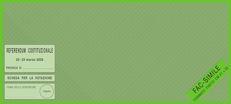 Sarà di colore verde la scheda del referendum confermativo del 22 e 23 marzo, quando gli aventi diritto dovranno recarsi ai seggi per approvare o abrogare la legge costituzionale riguardo a "norme in materia di ordinamento giurisdizionale e di istituzione della Corte disciplinare". L'ha diffusa il Viminale sul suo sito web. I seggi apriranno dalle 7 alle 23 di domenica 22 marzo e dalle 7 alle 15 di lunedì 23 marzo. I dati su affluenza e risultati del referendum saranno disponibili online su Eligendo e sull'app Eligendo Mobile.