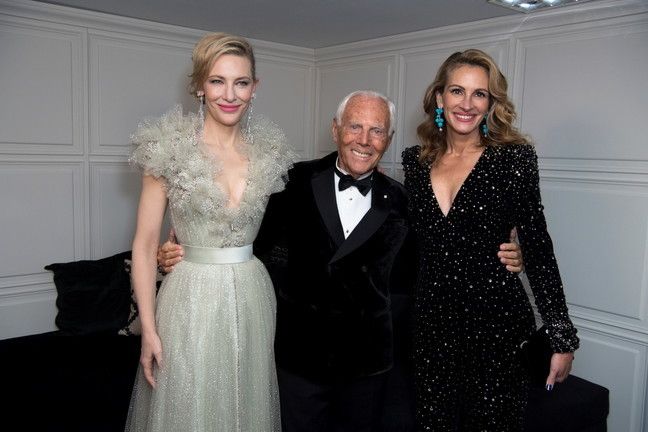 © Ufficio stampa|Giorgio Armani con Cate Blanchett e Julia Roberts (Photocredit Stefano Guindani)