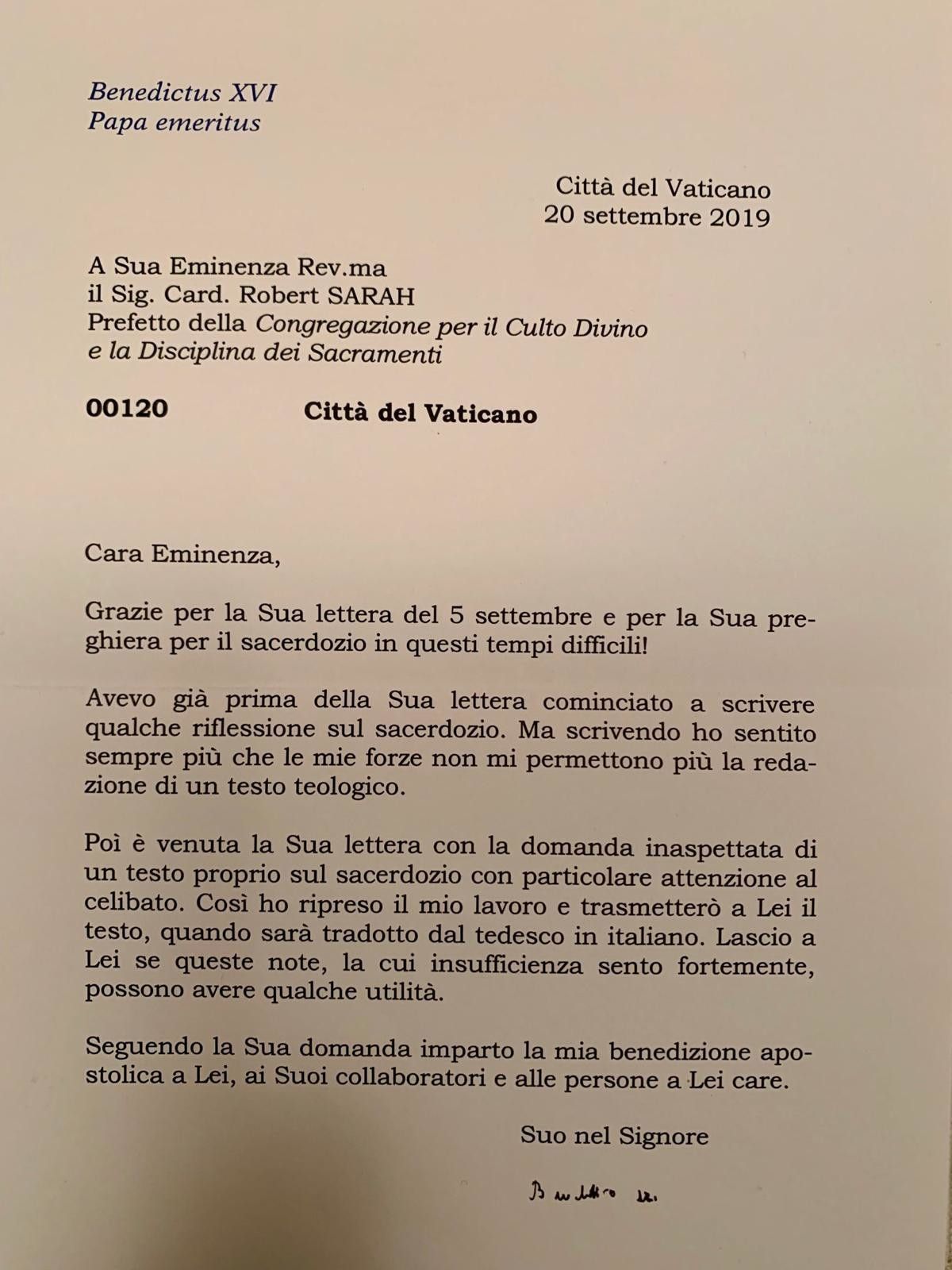 Celibato dei sacerdoti, il cardinale Sarah diffonde le lettere di Benedetto XVI
